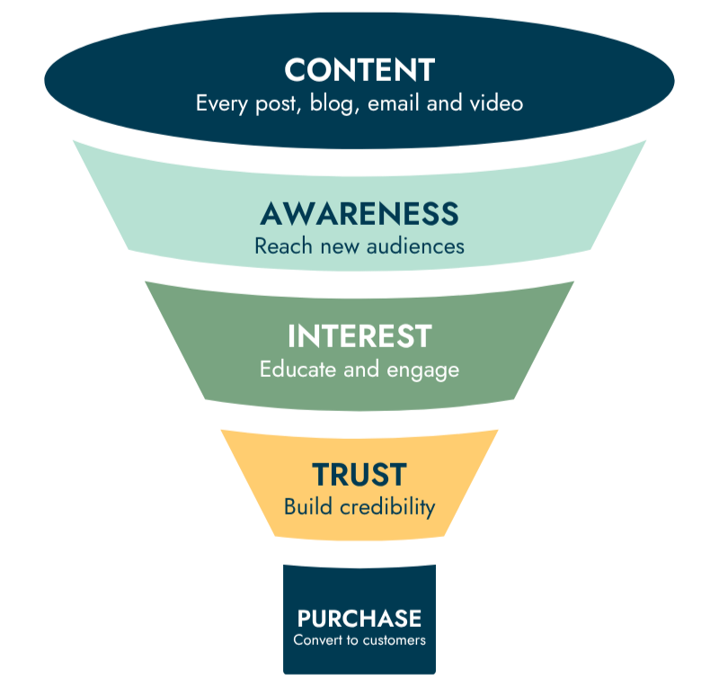 Content marketing funnel showing how brand awareness leads to interest, trust, and purchase — The Winfield Creative